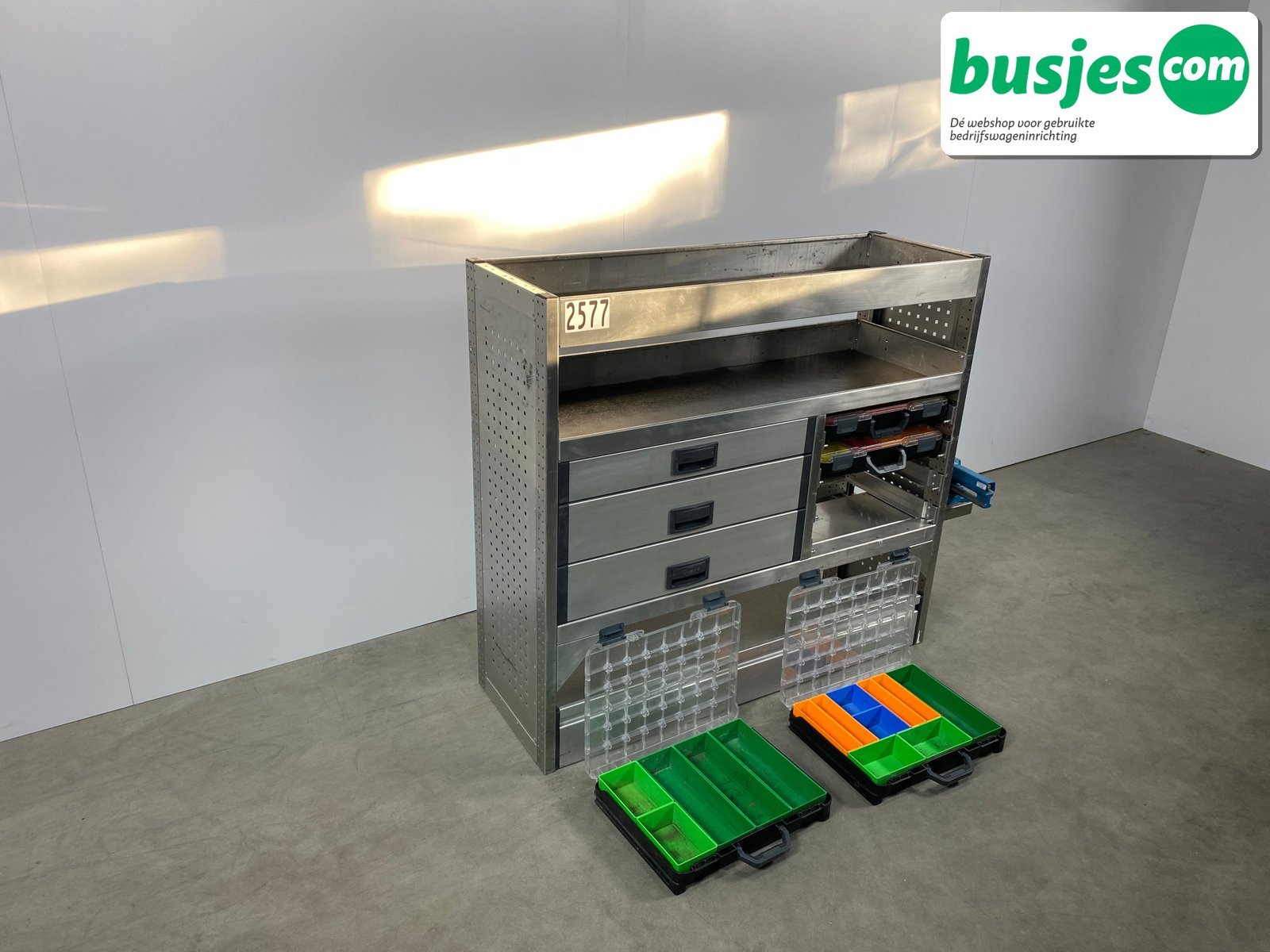 👉 Belangrijk: dit is een gebruikte inrichting. De staat is goed, maar check de afmetingen goed. Meet je voertuig zelf na of laat het doen, zodat je zeker weet dat het past.