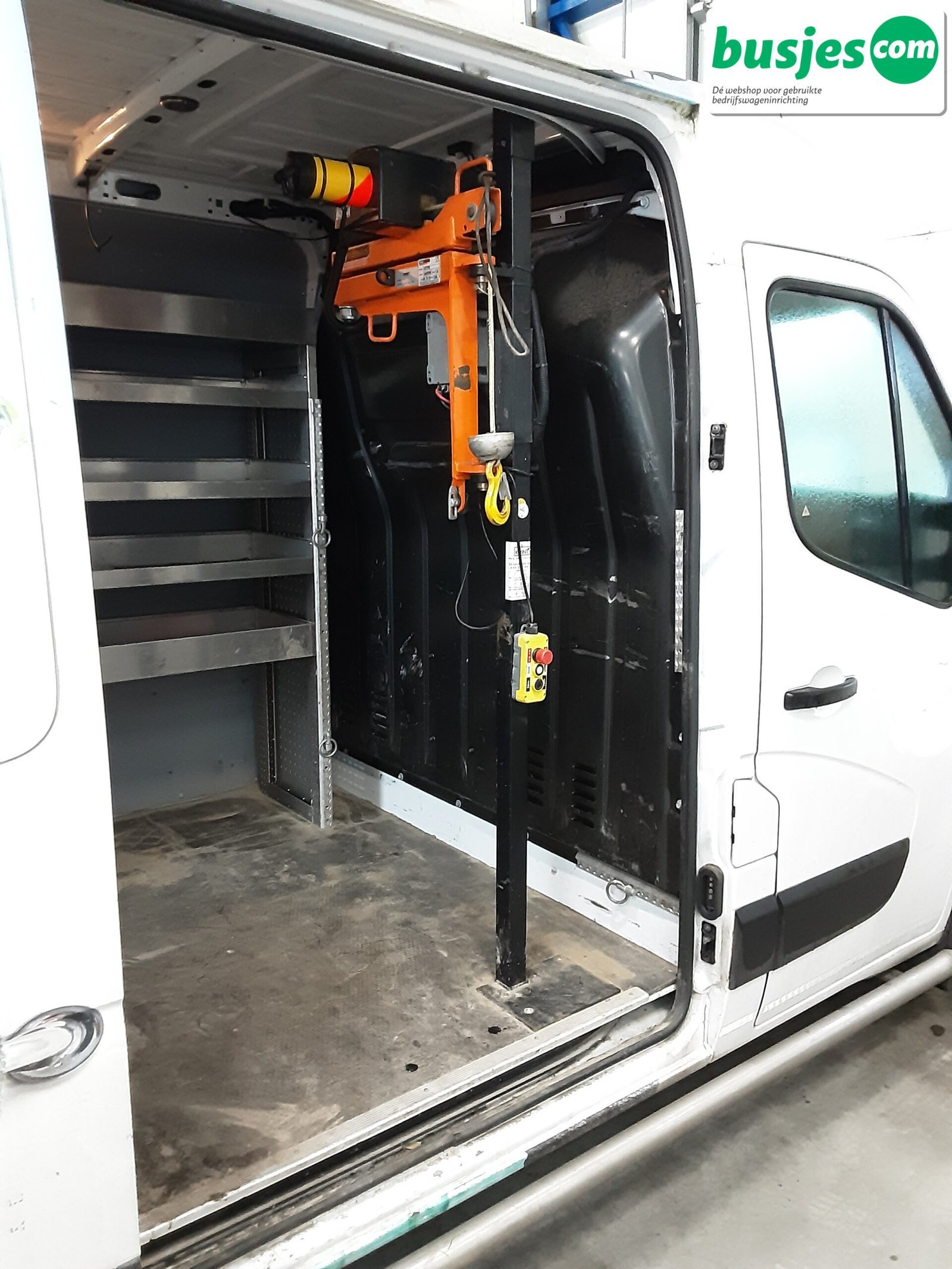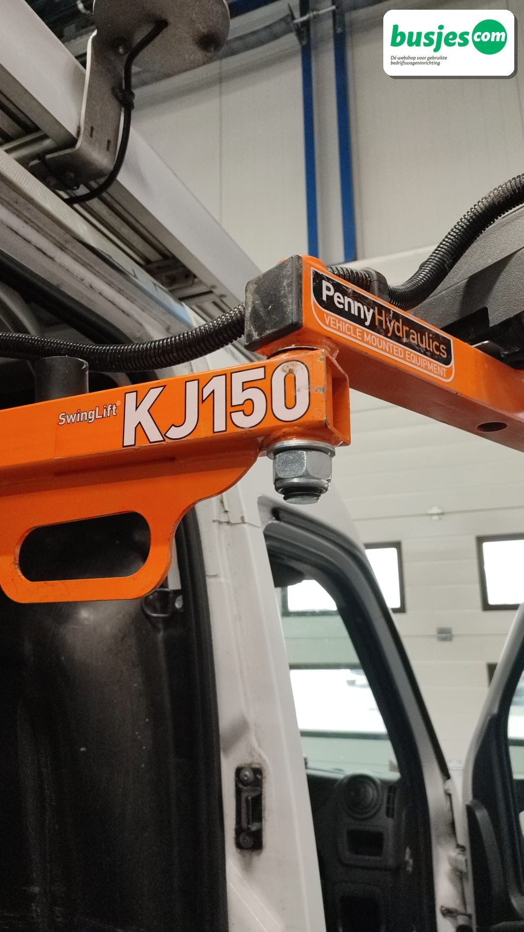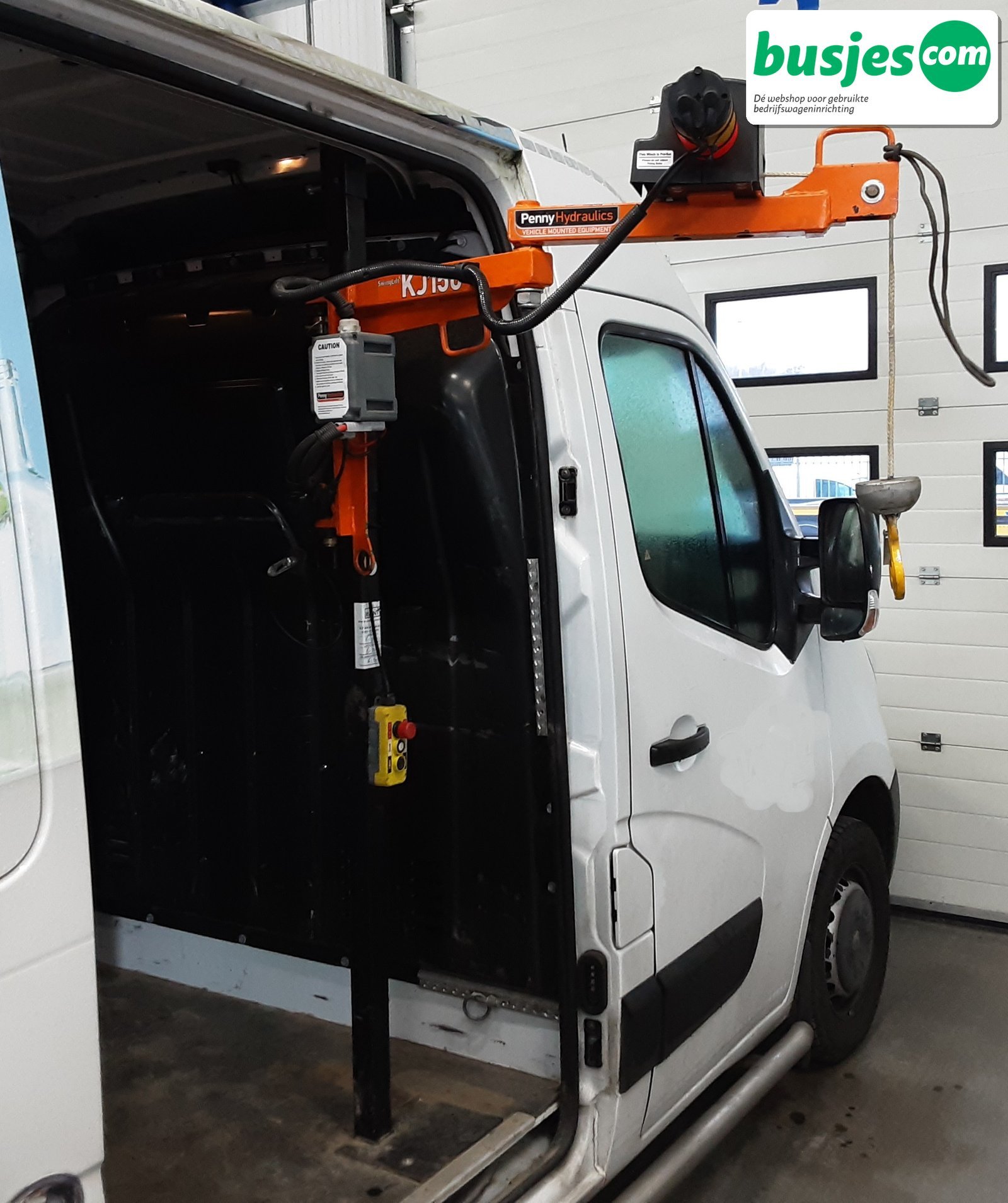 Deze gebruikte Penny kraan KJ150 (12V) is afkomstig uit een Renault Master H2 en wordt geleverd inclusief maatwerk pilaar, uitgevoerd voor montage rechts bij de schuifdeuropening. Een complete en praktische oplossing voor het veilig en efficiënt laden en lossen van materialen.